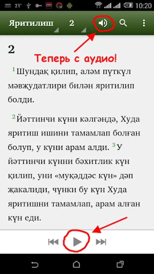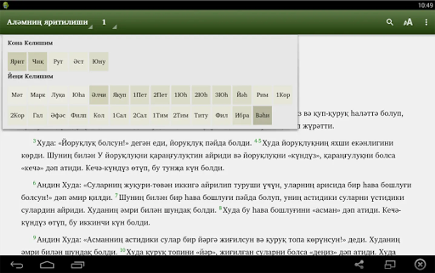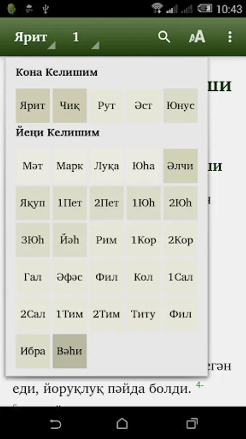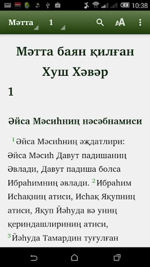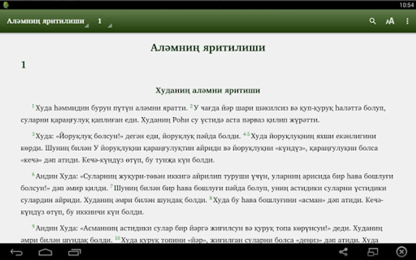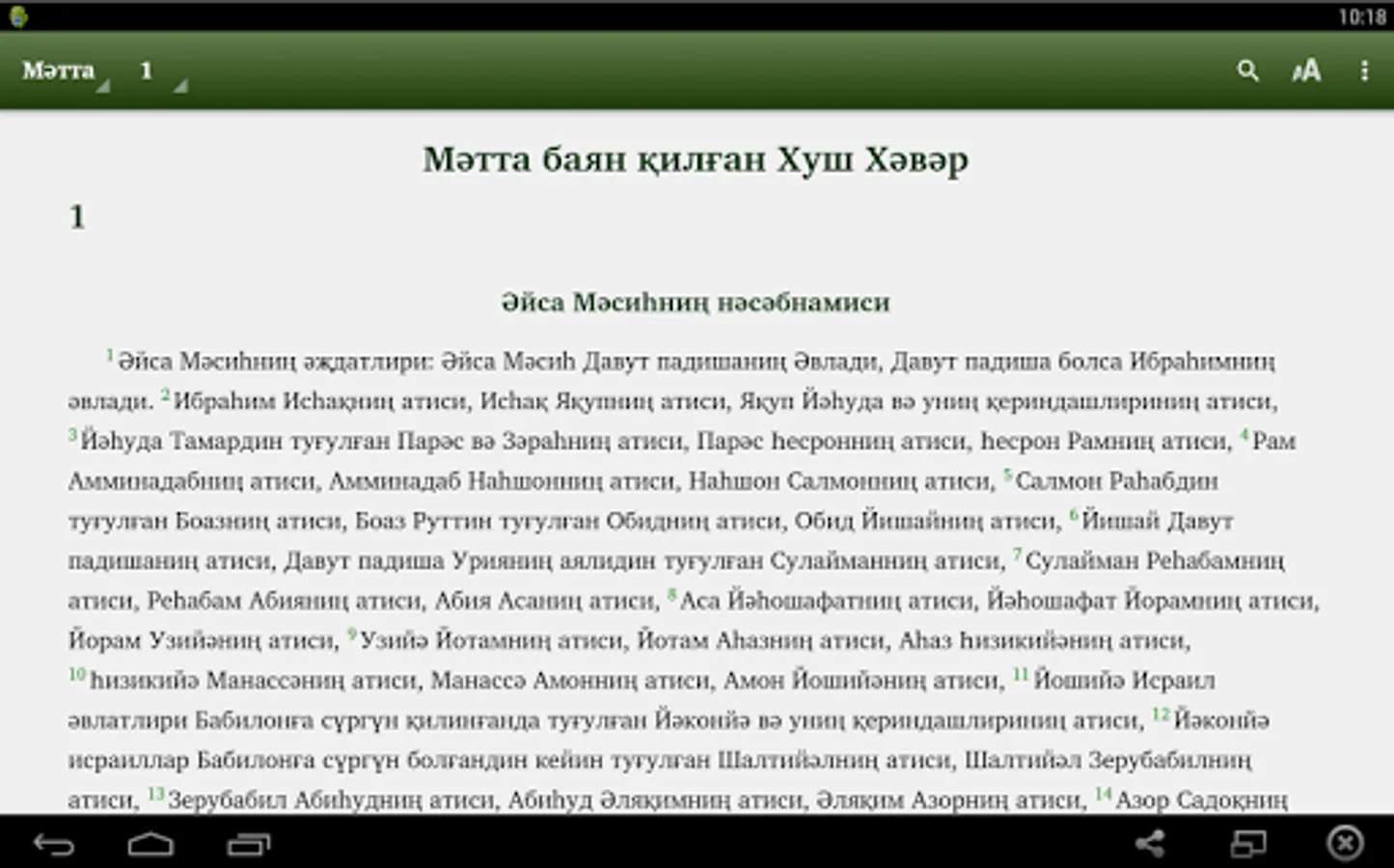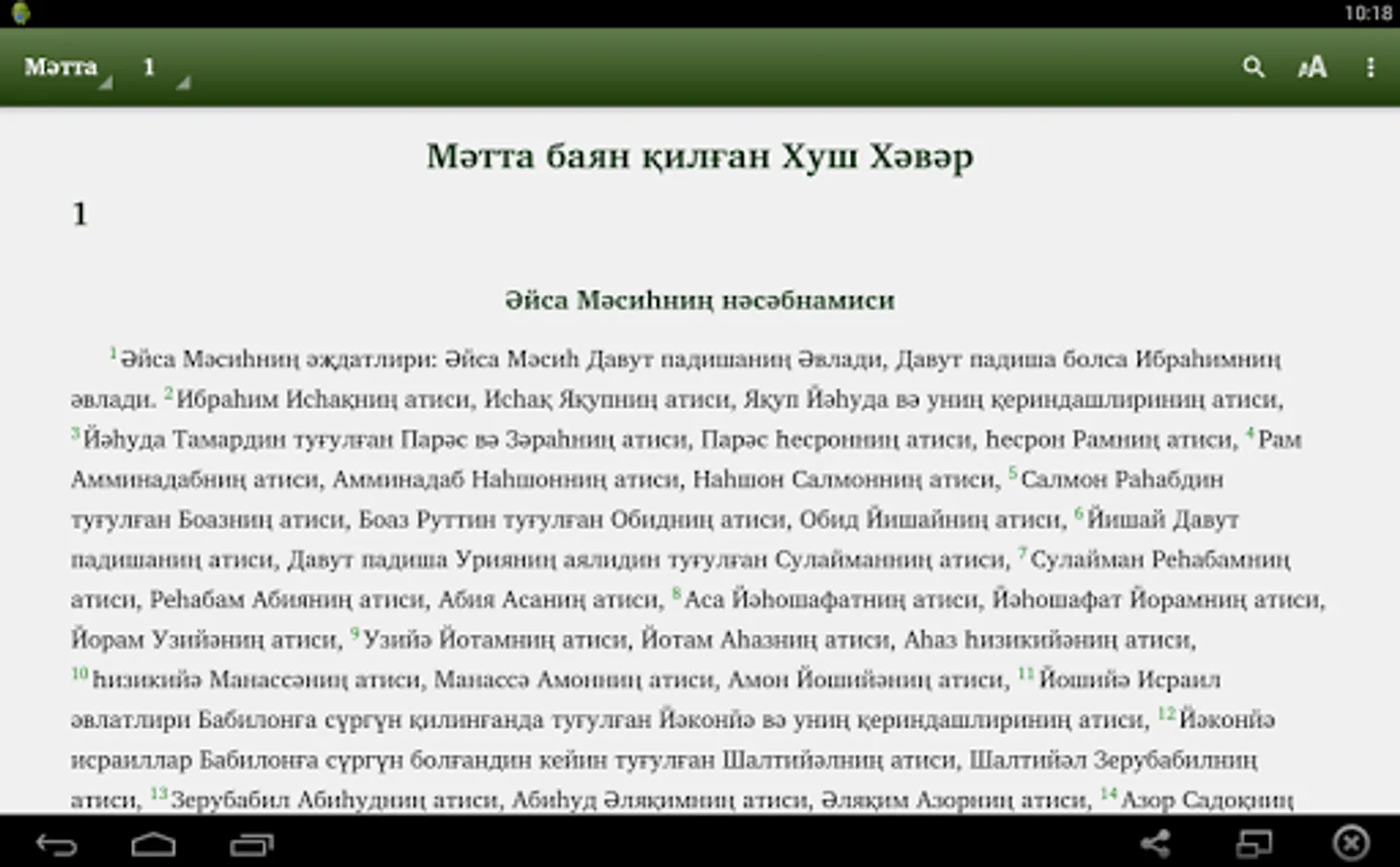 This app is for Uyghur people to read Bible in Cyrillic script. Many Uyghurs from Kazakhstan, Kyrgyzstan, Uzbekistan, and other states in Central Asia read Cyrillic script. This Bible app has complete Injil (New Testament) and portions of Torah, and the book of Psalms, and portions of the Writing of the Prophets (Old Testament). The translations of the rest of the Torah and Writing of the Prophets (Old Testament) are in progress. The app will be updated when new portions are ready. In the app you can select which portion to read and chapter. You can search for words. Soon we want to add audio streaming. Thanks you for downloading app. We pray you to enjoy the Bible.
