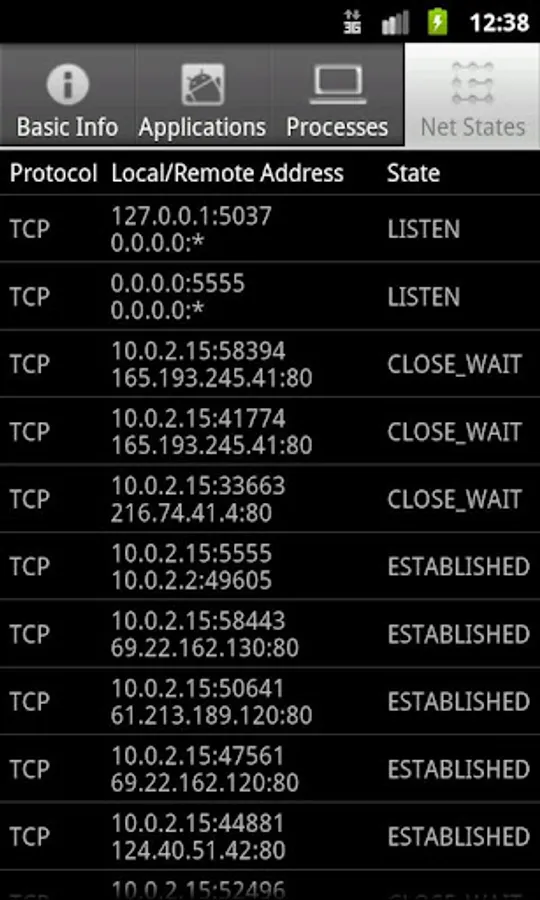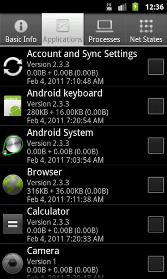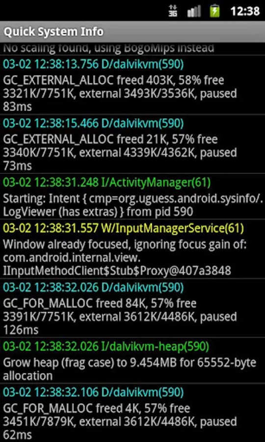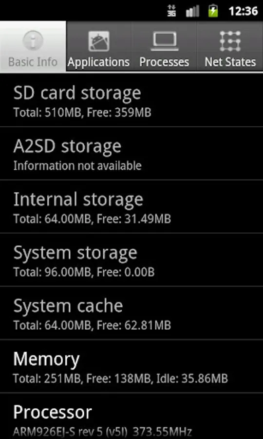 Quick access of the basic system information for your Android platform, including information for CPU, memory, SD Card, running processes, network states and installed applications.