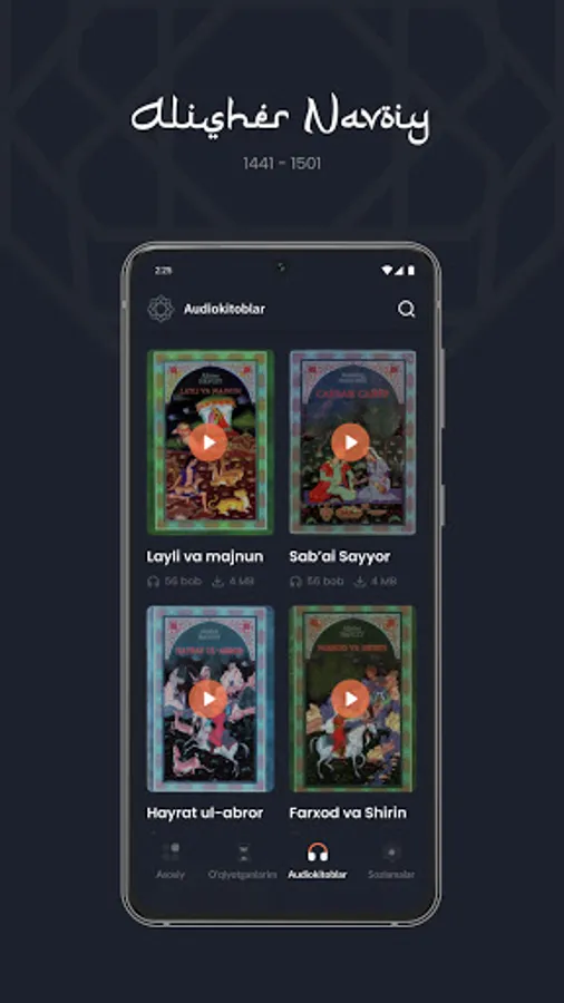 Audiokitoblar - standart ko'rinishidagi audio funksiyalarga ega kitoblarni ovozli eshitish. Har bir audio tagida uning matn ko'rinishidagi tavsifi berilgan.