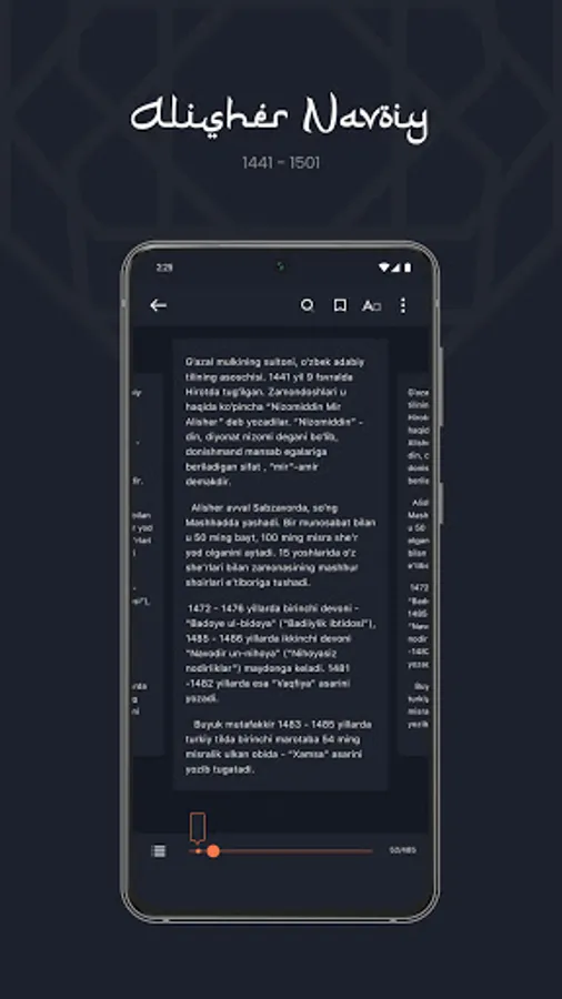 Mazkur ilova beshta muhim tashabbus doirasida Alisher Navoiyning boy merosini o'rganishni keng targ'ib etish maqsadida ishlab chiqildi. Ilovada Alisher Navoiyning Xamsa asari, g'azal va dostonlari hamda ibratli so'zlari o'rin olgan.