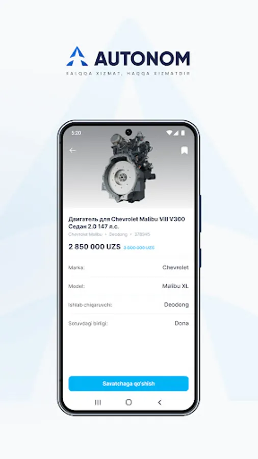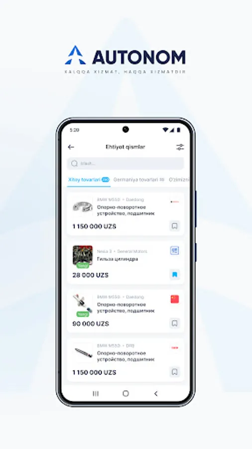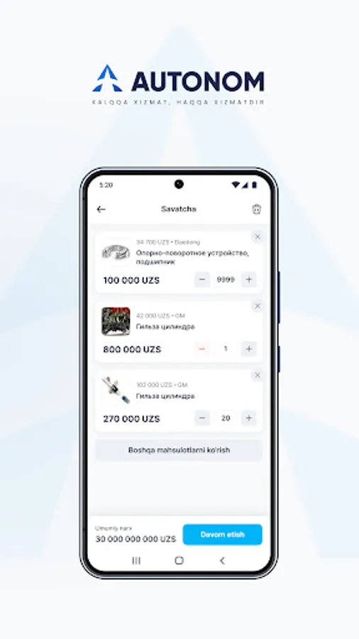 Avtomobil ishqibozlari va yuqori sifatli avtomobil jihozlarni qidirayotgan mutaxassislar uchun eng yaxshi onlayn-do'kon Autonomga xush kelibsiz. Autonom yordamida siz avtomobillarga texnik xizmat koʻrsatish va taʼmirlash ishlarini har qachongidan ham osonlashtirib, avtomobil mahsulotlarining keng toʻplamini xarid qilishingiz mumkin. Avtomobil ishqibozlari va professional mexaniklarning ehtiyojlarini qondirish uchun sinchkovlik bilan tanlangan avtomobil asboblari, jihozlari va aksessuarlarining keng tanlovini kashf eting. Bizning qulay interfeysimizni ko'rib chiqing, u erda siz turli bo'limlar bo'ylab osongina harakat qilishingiz va kerakli vositalarni topishingiz mumkin. Eng zo'r avtomobil vositasini topganingizda, uni savatga qo'shing va uni rasmiylashitirishga o'ting. Buyurtmangiz tasdiqlangandan so'ng, bizning maxsus jamoamiz uni tezda qayta ishlaydi va siz tanlagan manzilga tezkor yetkazib berishni ta'minlaydi. Avtonom ilovasini bugun yuklab oling va avtomobil imkoniyatlari dunyosini oching. Barcha avtomobil ehtiyojlaringiz uchun ishonchli onlayn manzilingiz bo'lgan Autonom ilovasi bilan avtomobilingizga texnik xizmat ko'rsatish va ta'mirlash ishlarini yaxshilash imkoniyatiga ega bo'ling.