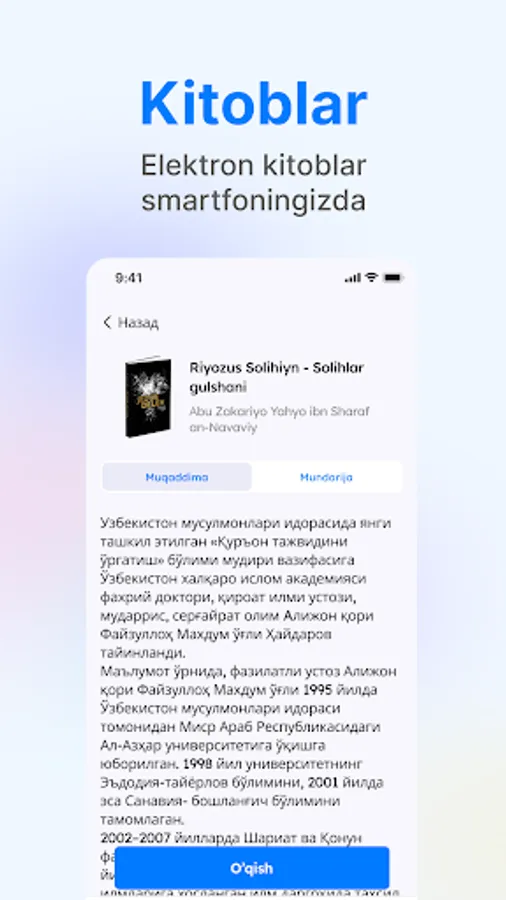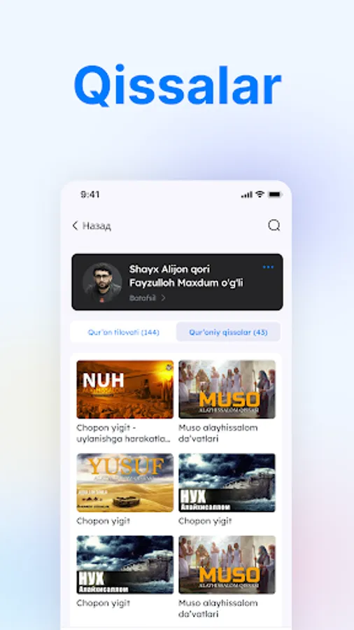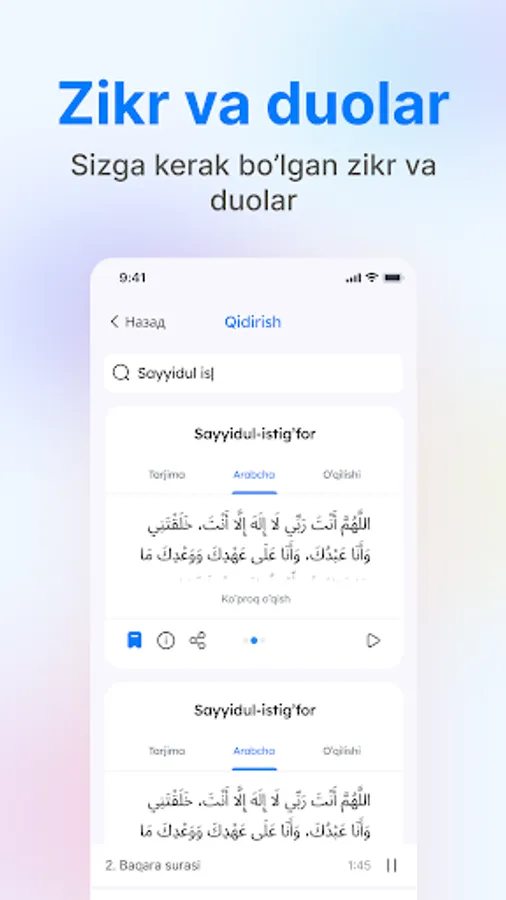 Bitta ilovada integratsiyalashgan mashhur Qorilarning qiroatlari bilan, Qur'onning go'zalligidan zavq oling. Audio va yozma formatda mavjud bo'lgan, jozibali hikoyalar va kitoblardan iborat keng kutubxonamiz bilan bilim olamiga sho’ng’ing. Zikrlar va duolar uchun maxsus bo'lim bilan ruhiy holatingizni yuksaltiring, bu sizga qalbingiz bilan chuqur bog'lanish imkonini beradi.