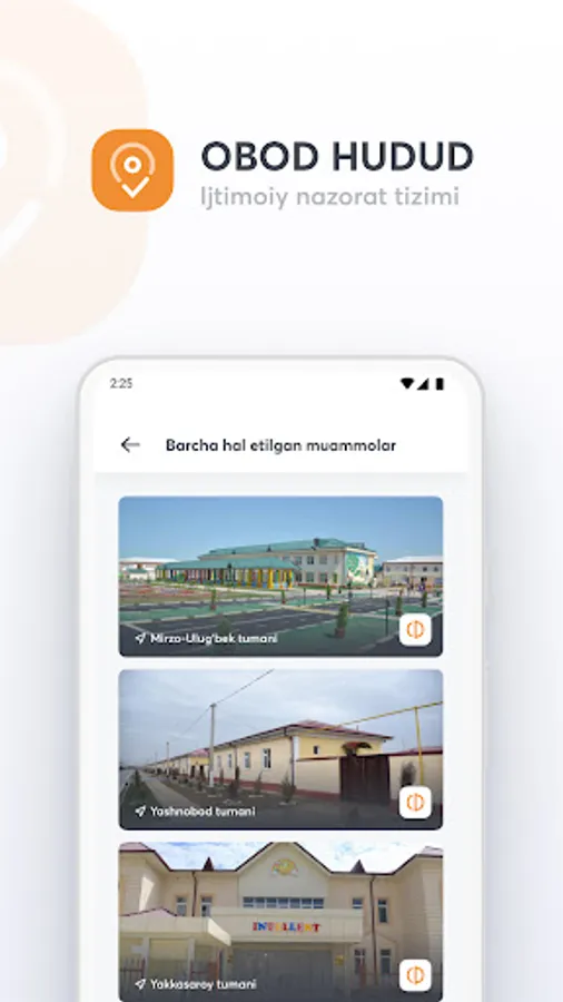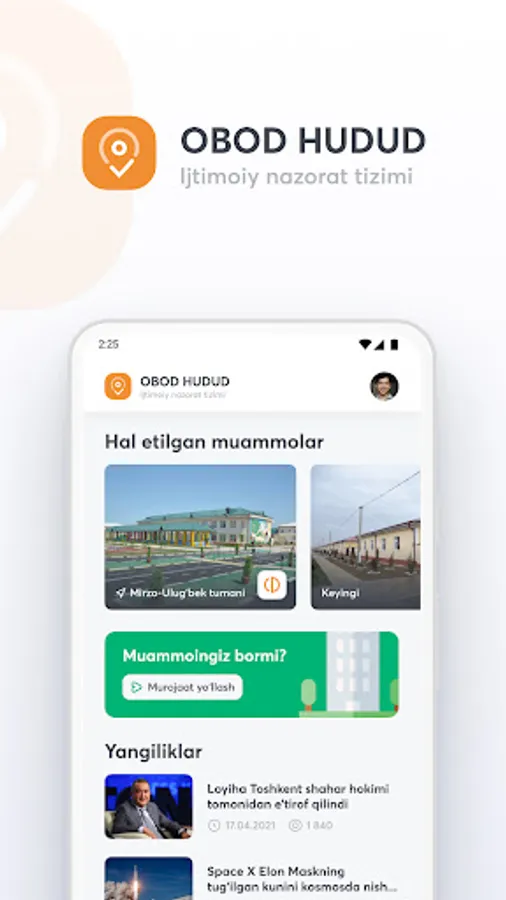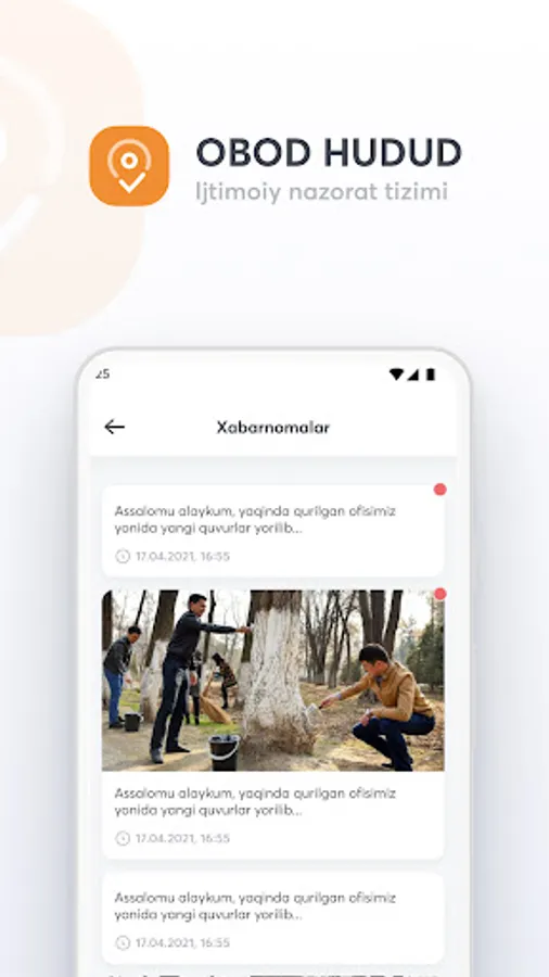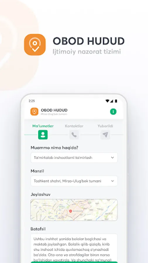 Obod Hudud ilovasi yordamida jamiyatimizdagi ekologik muammolarni oddiy fuqorolar bilan birgalikda hal qilamiz. Ushbu tizim orqali har bir inson fuqorolik pozitsiyasini nomoyon eta oladi. Hududingizdagi muammolar va kamchiliklarni ma'sul shaxslarga tez va qulay yetkazish uchun ilovani yuklab oling.