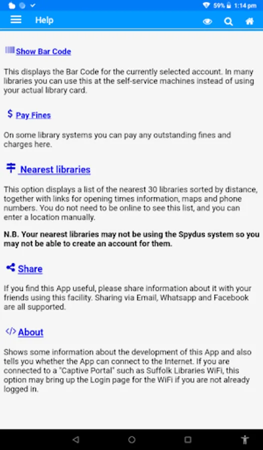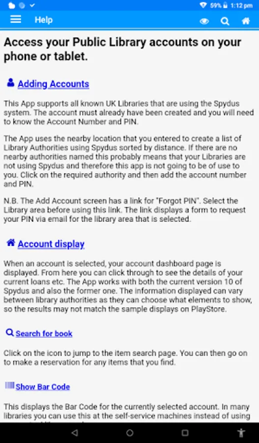 ★ One press access to your library's accounts on your phone or tablet. Saves all your Library Account Numbers and PINs for multiple accounts making it easy to check on what you have borrowed and what is about to become overdue. Works with 40+ UK library areas using the Spydus system. See the list below. Now updated for the latest Spydus release