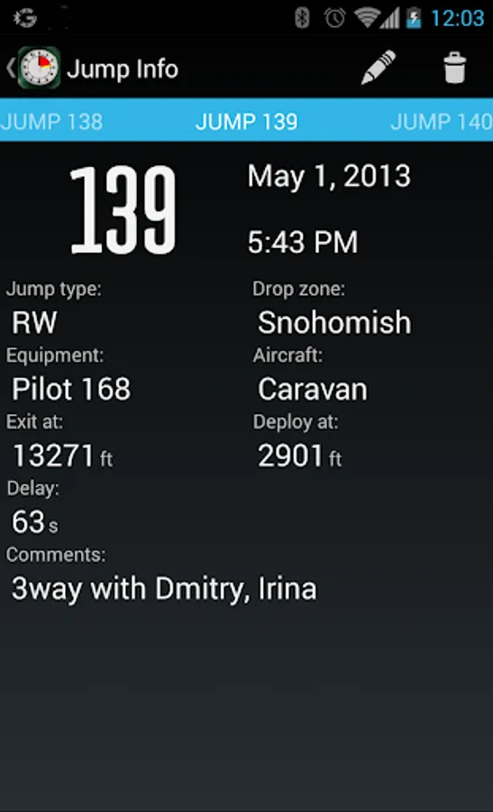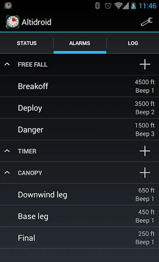 Skydiving audible altimeter and log book. Using pressure sensor built into your phone Altidroid works just like your regular audible playing sound alarms during freefall and recording a log of your jumps. Simply activate the application while on the ground, connect your headphones and jump.