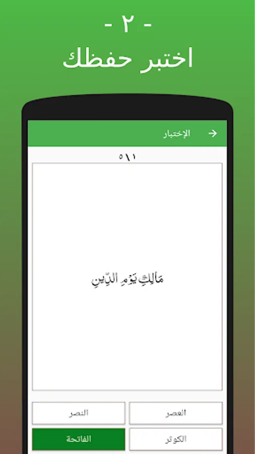 - اختبر حفظك: تحدى نفسك عن طريق أسئلة عن آيات السور المتاحة وأجب بشكل صحيح لكي تجمع النقاط ولكي تترقى بالمستوى.