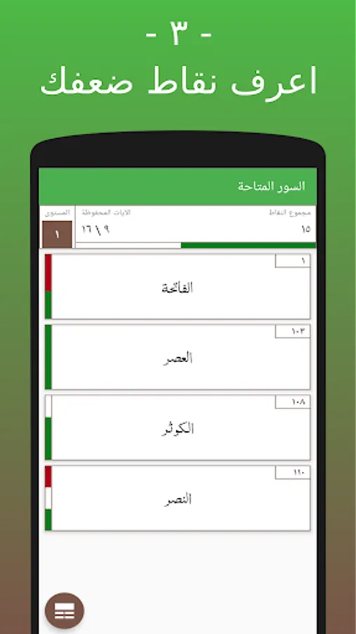 - اعرف نقاط ضعفك: سوف يظهر لك التطبيق السور التي أجبت بعض آيتها بشكل خاطئ أو صحيح لكي تعرف السور التي تحتاج لمراجعتها.