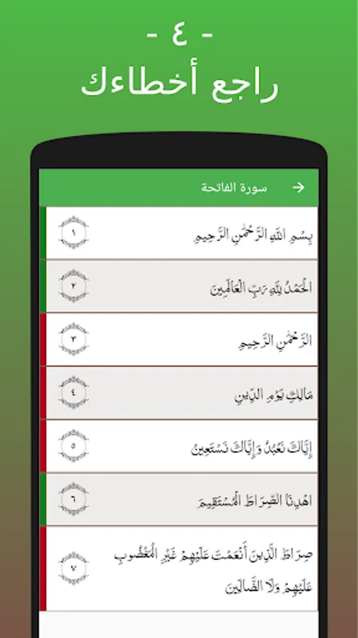 - راجع أخطاءك: عند تصفح السور سوف يظهر لك التطبيق الآيات التي أجبت عليها بشكل خاطئ أو صحيح لكي تعرف الآيات التي تحتاج لمراجعتها.