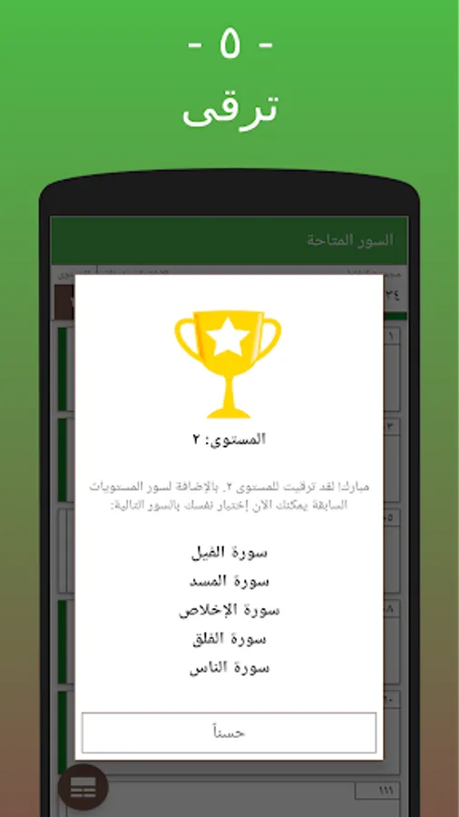 - ترقى: عند إجابتك لجميع آيات السور المتاحة بشكل صحيح ستترقى بالمستوى وسيتاح لك سور أكثر بشكل تدريجي وسلس.