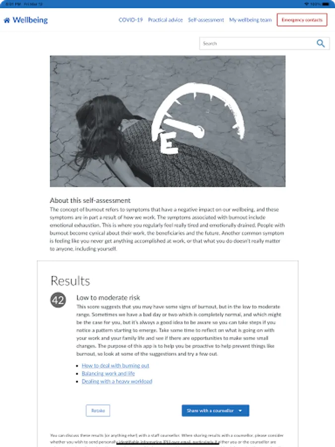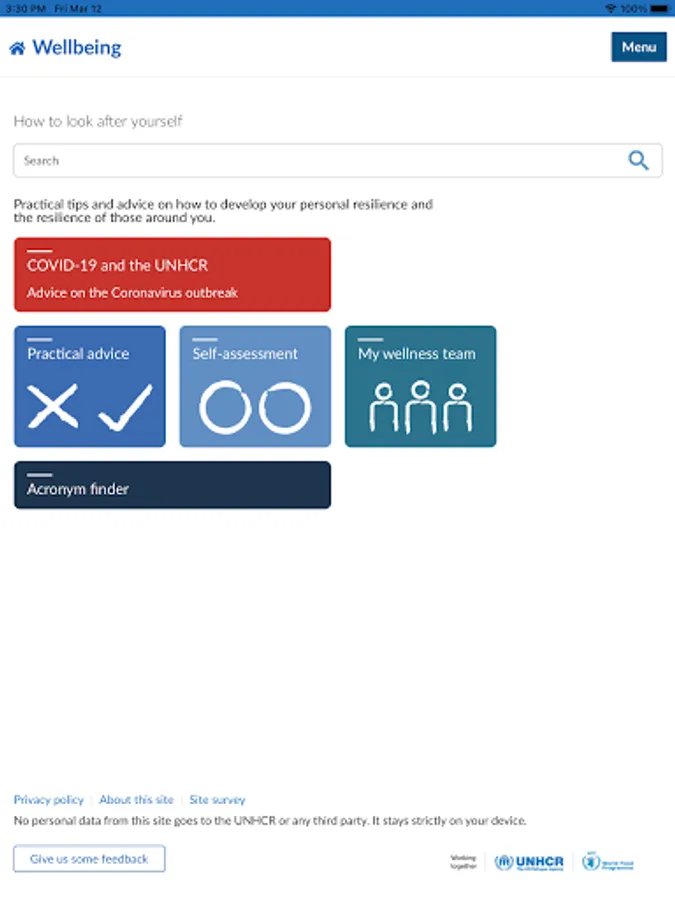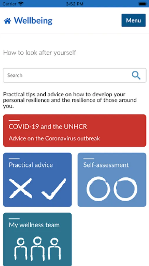UNHCR Wellbeing app is designed for UNHCR personnel worldwide to provide them with practical help and guidance related to their mental health and psychosocial wellbeing. The UNHCR Wellbeing app offers an opportunity for self-assessment with instant feedback, learning more about mental health issues through easy-to-read articles, videos and links. Contemporary topics such as coping with COVID-19 are included. Upgrades in terms of content and functionality will be made regularly on the basis of the uses’ feedback. The UNHCR Wellbeing app does not collect personal information from any of the offered tools and the users can rely on the confidentiality of their information.