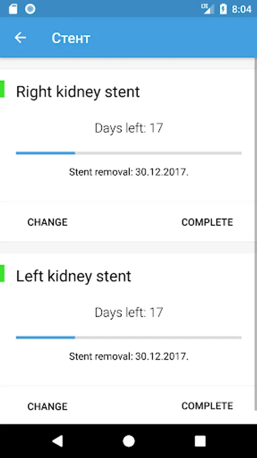Given the high percentage of forgotten kidney stents, which get encrusted with time, removal of which requires additional surgery, we created a section called "STENT RADAR" where you can set the date of the stent installation and the date of its planned removal, and your phone does the rest - it will remind you of the need to visit the doctor.