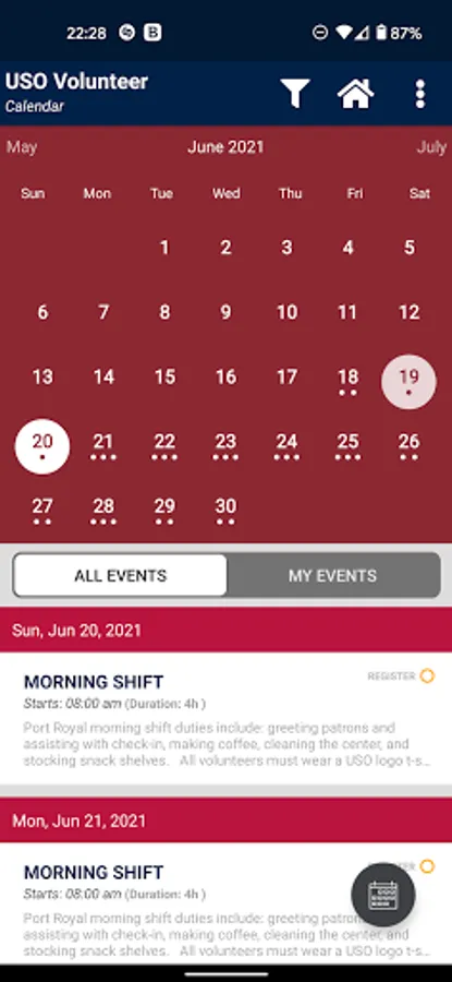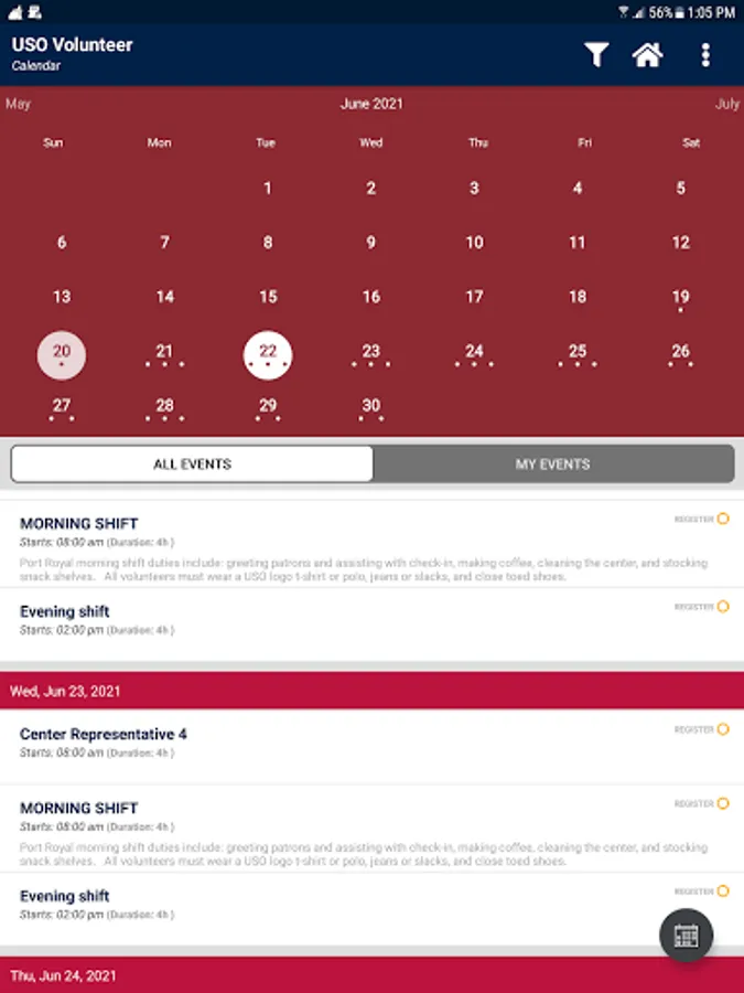 This app is for active volunteers. If you would like to register to become a USO volunteer, please visit www.volunteers.uso.org today to find your nearest center.