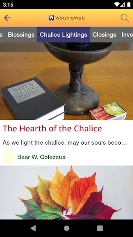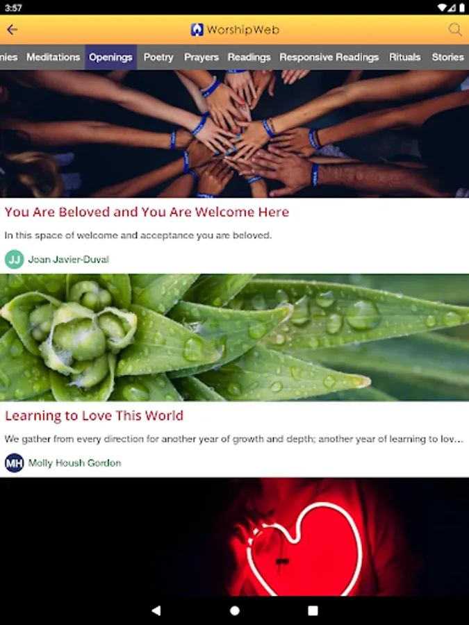 Access hundreds of inspirational words that cover a range of topics including: Affirmations, Benedictions, Blessings, Chalice Lightings, Closings, Invocations, Litanies, Meditations, Openings, Poetry, Prayers, Readings, Responsive Readings, Rituals, and Stories.