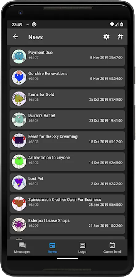 Your companion to IRE gaming! This app will help you keep up-to-date with game happenings while you're away. The IRE Helper provides notifications for messages and events, lets you read and write messages, check news posts, browse various logs, and keep current with events that are happening in the game.
