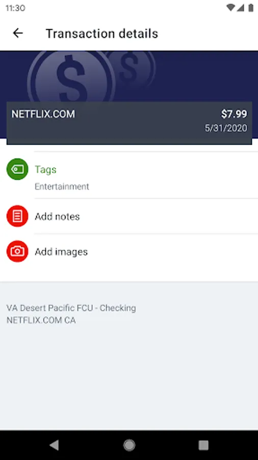 Add Tags, Notes, Images & Geo-Information: By enhancing transactions with custom tags, notes or photos of a receipt or check, you have the ability to stay organized and find exactly what you’re looking for when searching through your finances.