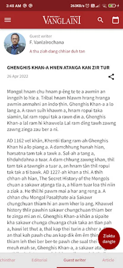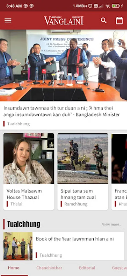 Vanglaini, the leading newspaper in Mizoram, started as a Mizo weekly in 1978, became a daily in 1986. Since then it has been continuously growing in circulation, readership and quality covering the entire state of Mizoram.