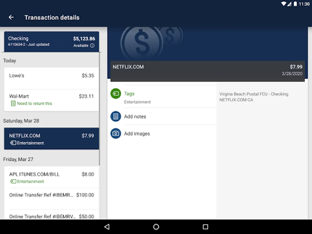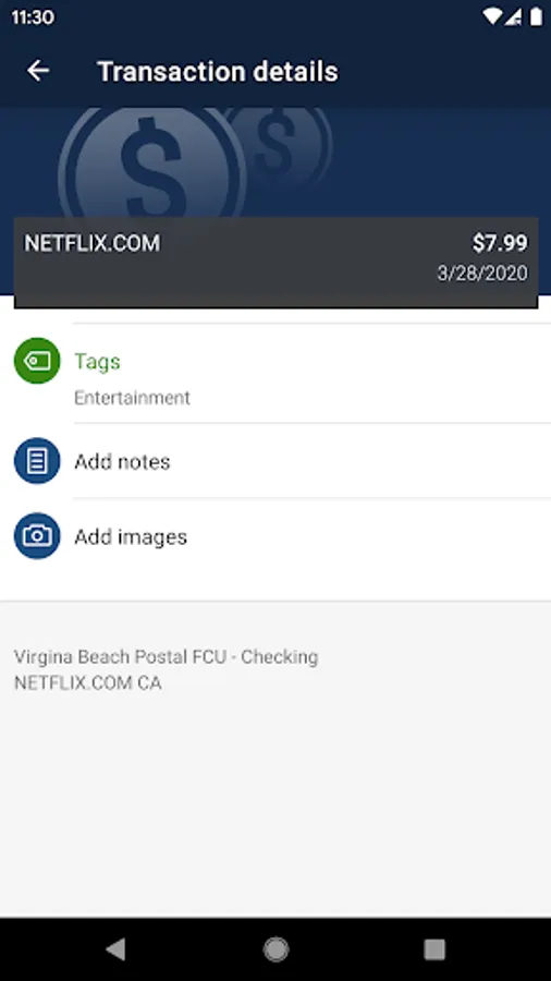 Add Tags, Notes, Images & Geo-Information: By enhancing transactions with custom tags, notes or photos of a receipt or check, you have the ability to stay organized and find exactly what you’re looking for when searching through your finances.