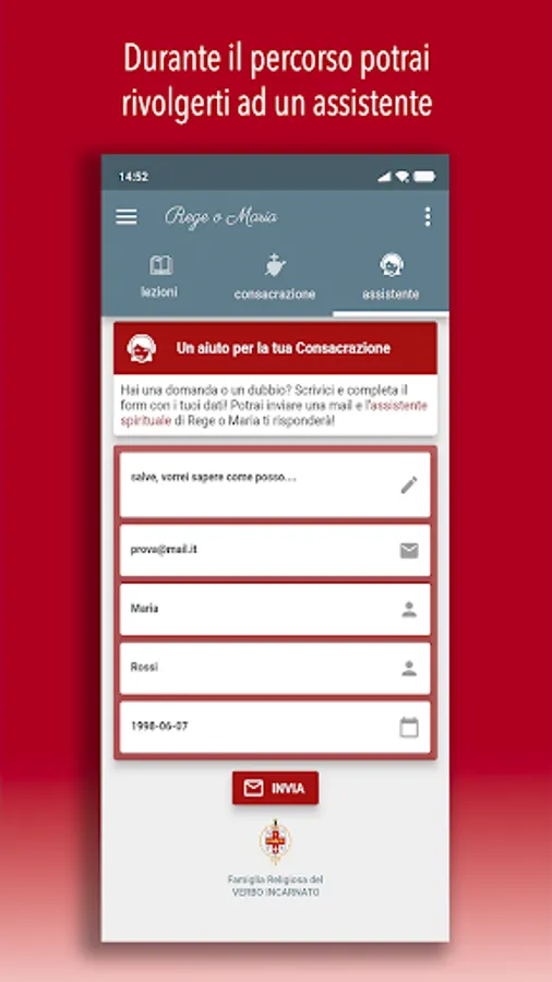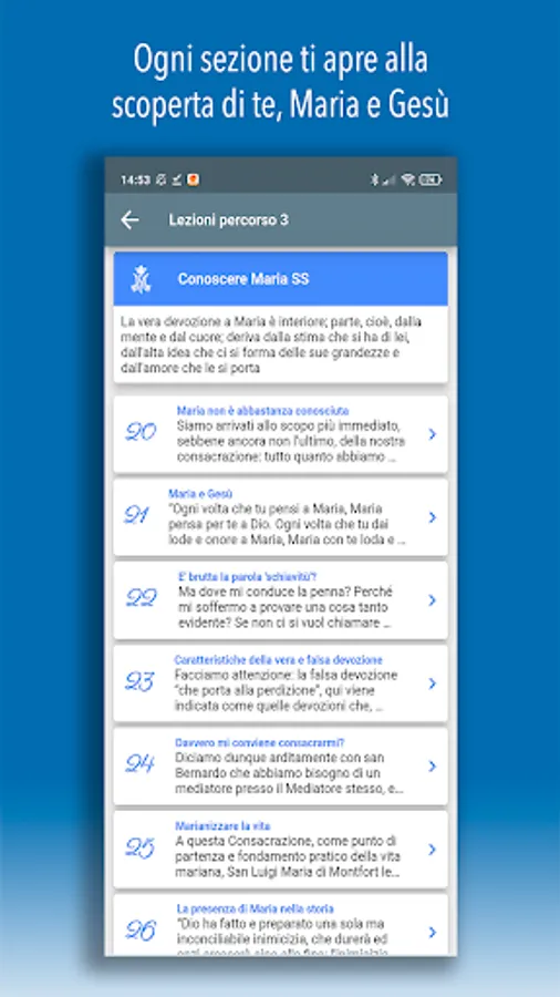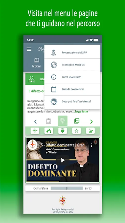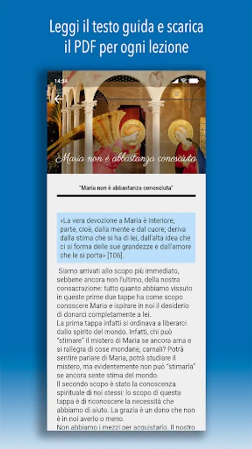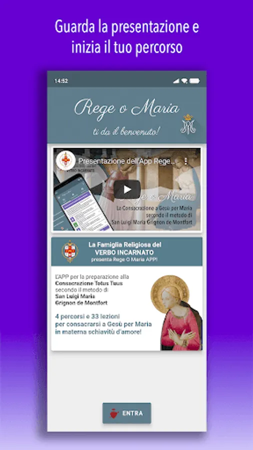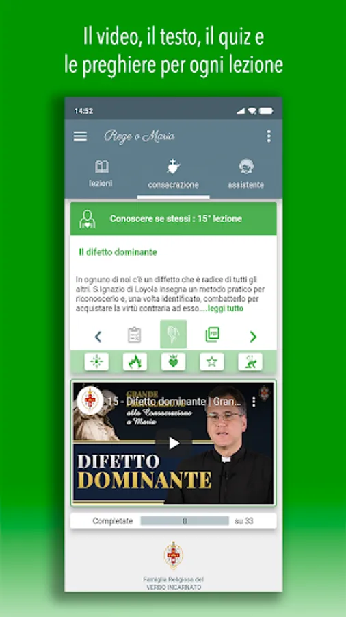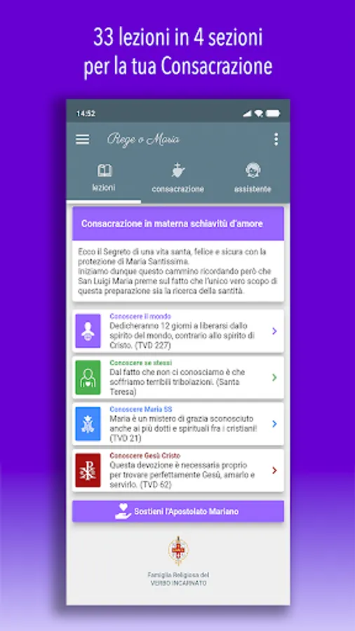 The App will offer you 33 lessons corresponding to the 33 days of preparation indicated by the saint of Montfort. The lessons will be accompanied by a video with the catechesis, a guide text, own prayers and a short optional test to verify the understanding of the lesson. To remove any doubts or difficulties in the path towards the total consecration of yourself to Mary and to better belong to Jesus, you can write to an assistant with a special function within the App.
