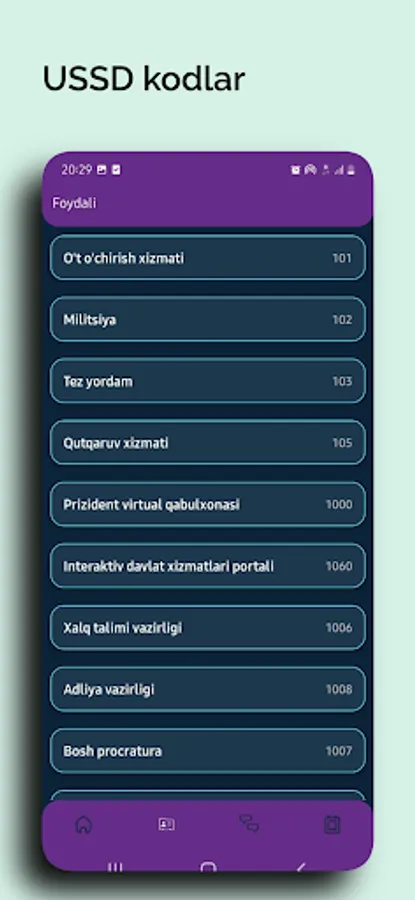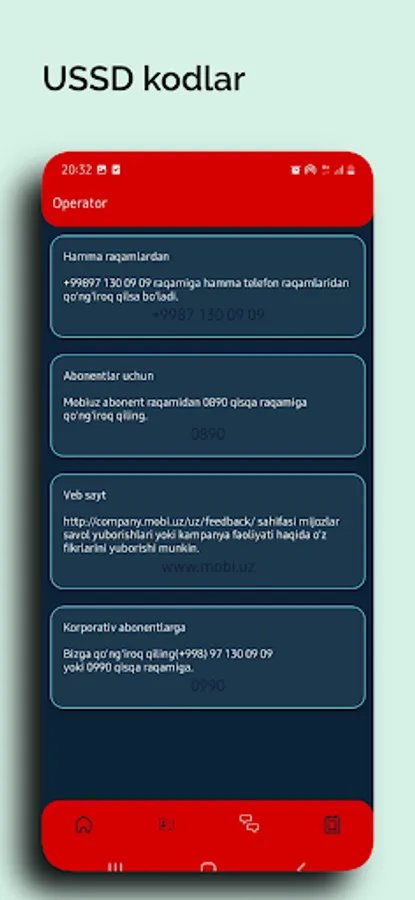 USSD Mobile dasturni o'rnatganingizdan so'ng aloqa operatorlari haqida barcha savollaringizga javoblar olasiz va quyidagi imkoniyatlarga ega bo'lasiz: