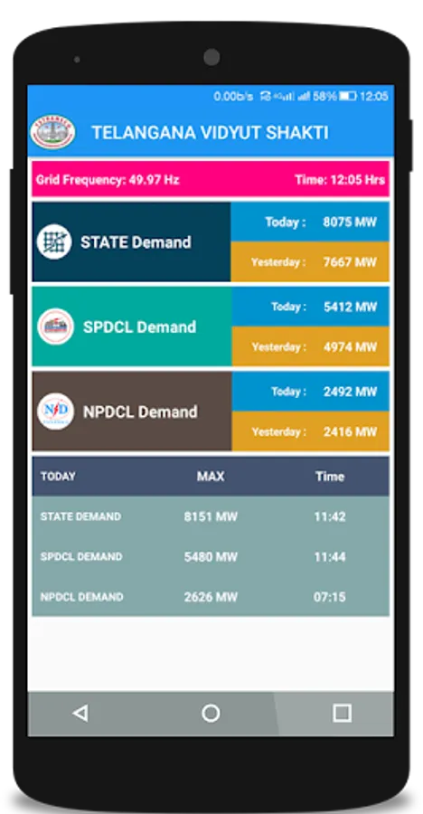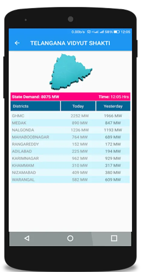 The Vidyut Shakti Mobile Application provides data pertaining to the Telangana State Demand in real time along with district wise. The real time data and comparison with previous day data is also available.