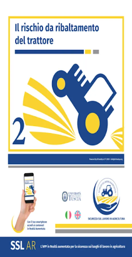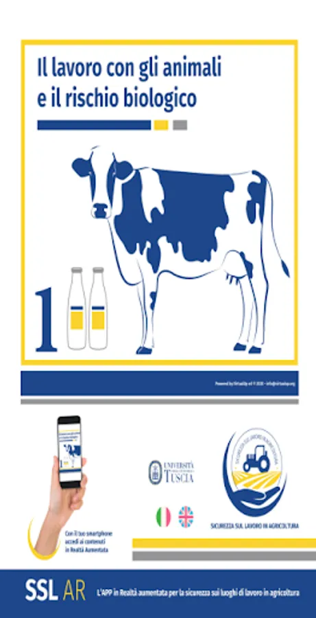 The application in Augmented Reality SSL AR of the Experimental Demonstration Center for Safety and Health at Work of the Department of Agricultural and Forestry Sciences of the University of Tuscia is a tool for the development and dissemination of research lines on safety, health and well-being of those who work in agriculture. The App allows you to visit the 10 information areas on OSH in agriculture and much more, by accessing content in Augmented Reality, developed by DAFNE at the experimental educational company "N. Lupori ”of Viterbo.