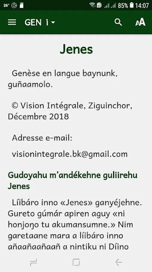 The book of Genesis is part of The Bible translated into baynunk guñaamolo language. With this app you can read and listen to some parts of Genesis in Guername Baynunk.