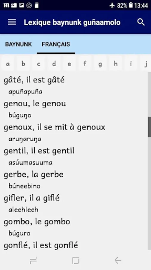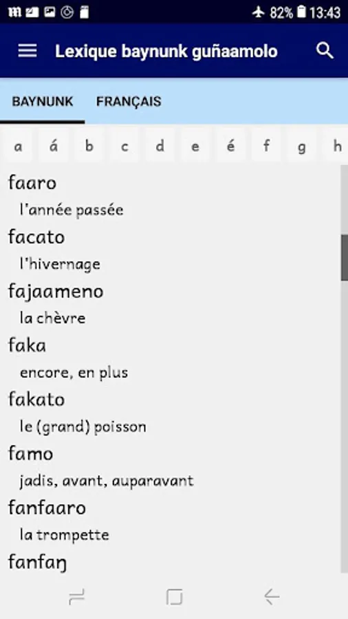 This lexicon groups more than 1,600 words. It also includes an index in French. We are waiting for your suggestions to improve this version of the lexicon. The entire baynunk community will benefit!