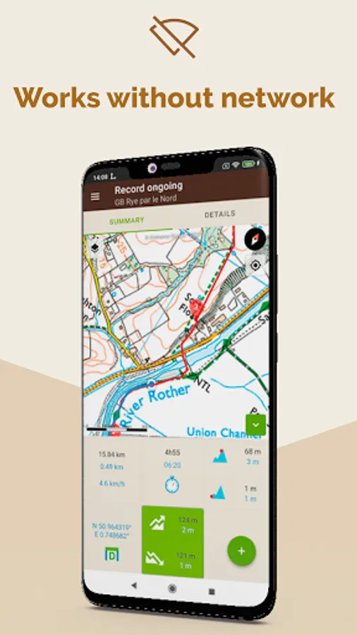 - Record a live route and follow your progress on the map (distance, duration, elevation gain…). If you lose