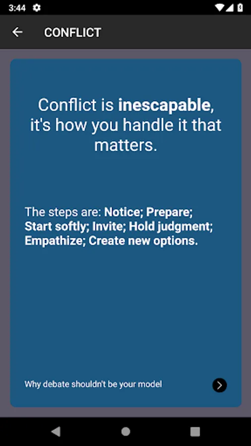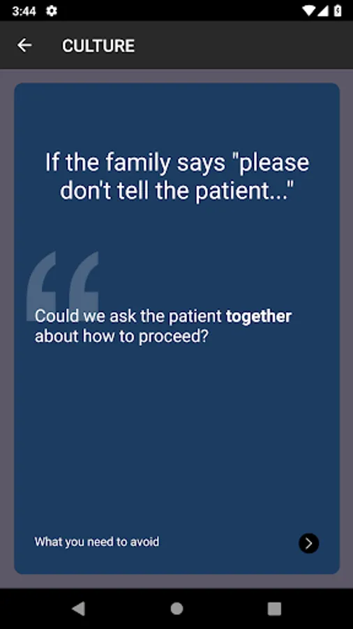 For this app, we've curated a special set of communication skill tips, focused on the moments where clinicians most often get stuck. You can flip through the tips by topic (serious news, prognosis, family conferences, goals of care, and more), or just get a daily tip as a notification. Read the tip (it'll take <10 seconds), try it out, and over time, your inner communication ninja will emerge.
