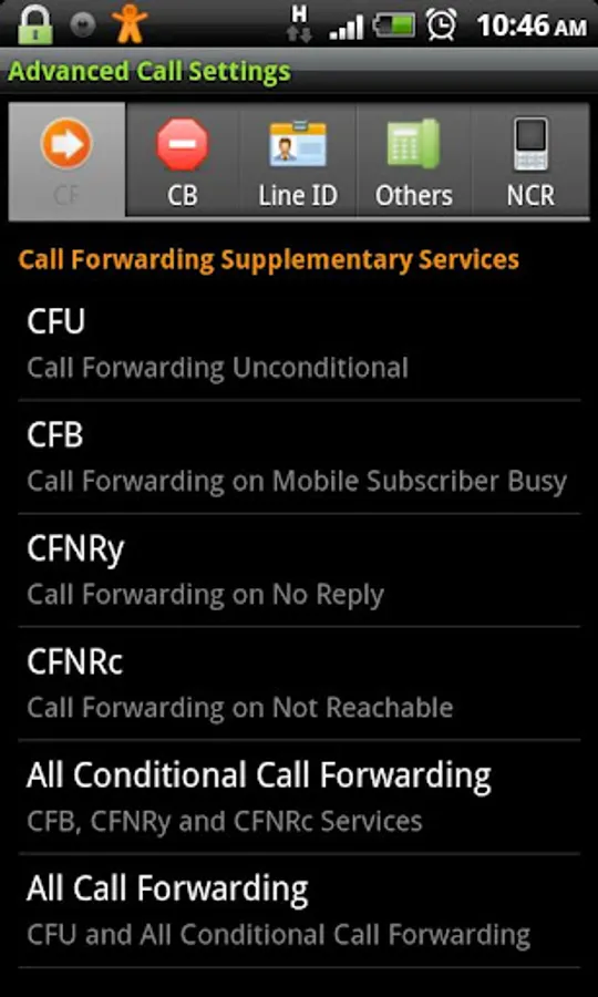 - Call Forwarding: CFU, CFB, CFNRy, CFNRc (for the meaning of these abbreviations, see below)