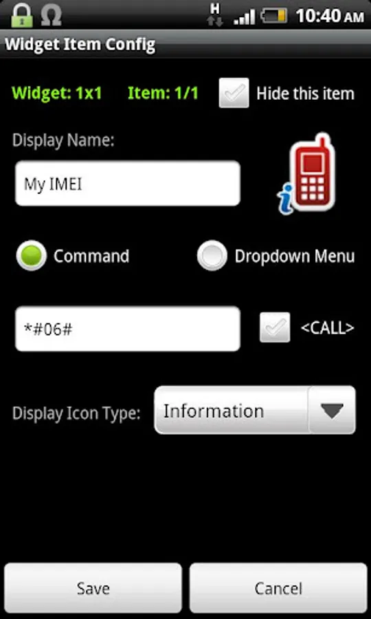 - In the Command field, you can enter the phone number (to call a person), the USSD string (e.g for balance checking, ask your mobile operator for the USSD syntax), or the MMI command (e.g *#21# {CALL} for call forwarding status, or *#06# for the IMEI...)