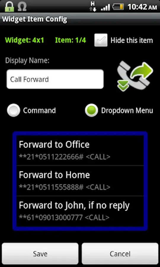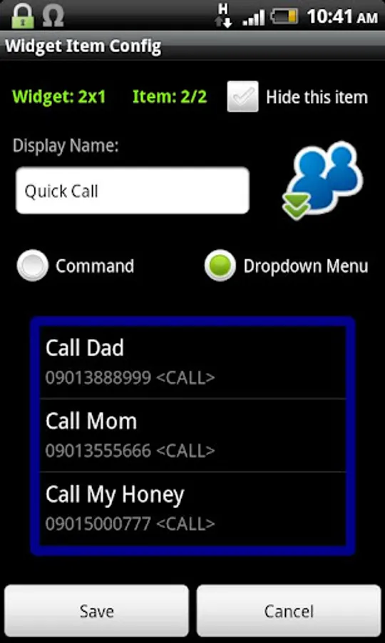 - You can set the item action when the user taps it on the home screen. Select “Command” radio button and enter command string that immediately executed, or select “Dropdown Menu” to display the menu.