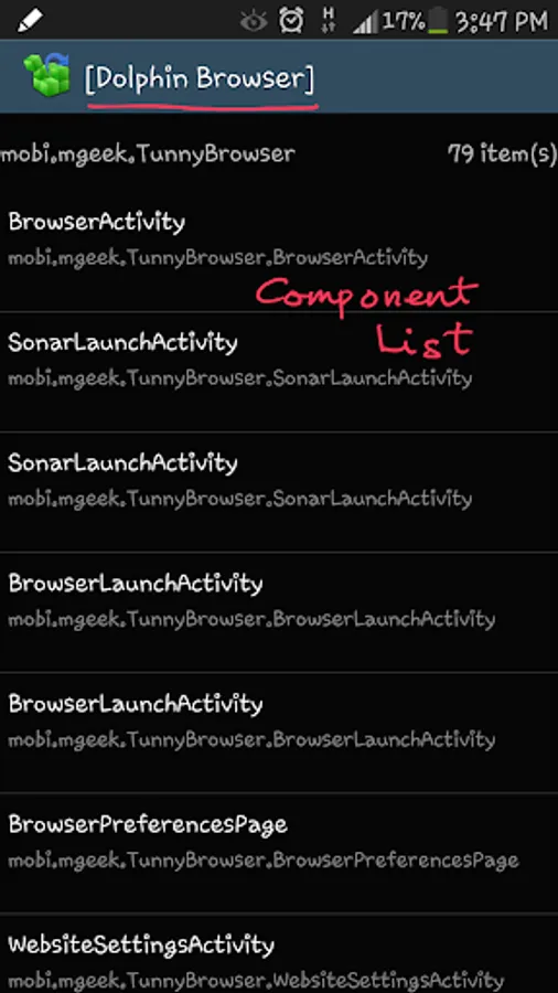 For each item in a list, the first line is the code, the second line is app name and the last one is broadcast receiver name.