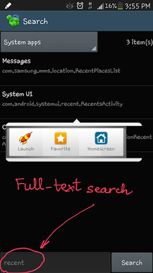 Tapping on the app will open the list of all components (activities) in that app. By tapping on the item, a context menu appears that will let you launch the target, add a shortcut for this target to the favorite list or the home screen for easy access.