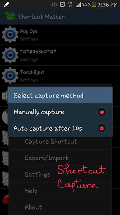 To manually capture, navigate to the desire app that you want to capture shortcut, pull down the system notification bar and tap on the 'Capture Shortcut' icon.