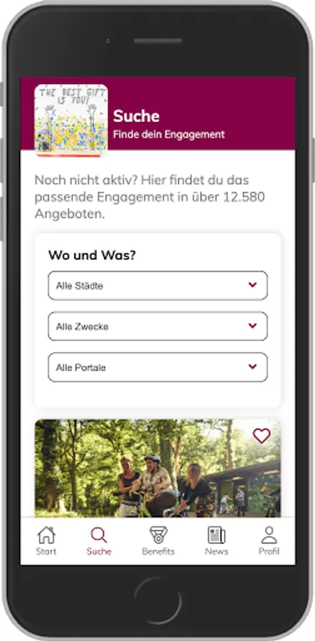 ☀ Find engagement - Search in> 15,000 engagement offers from various portals (such as vostel, GoVolunteer, Aktion Mensch, GoNature, youvo or betterplace).