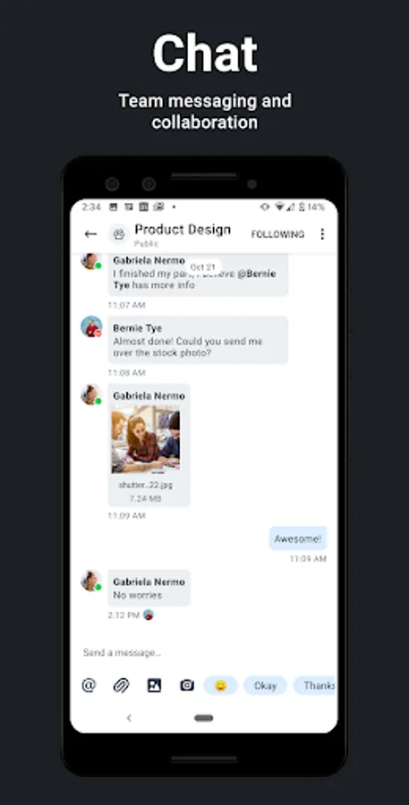 Check presence status and send messages, share files and @mention colleagues in 1:1, private or public chat rooms
