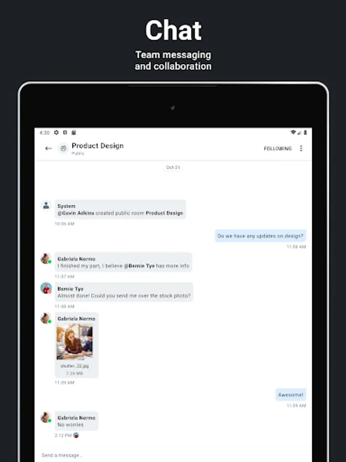 Reduce email reliance with public and private chat rooms to help your communications stay organized around projects
