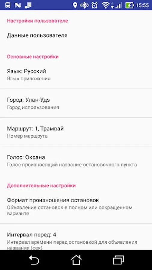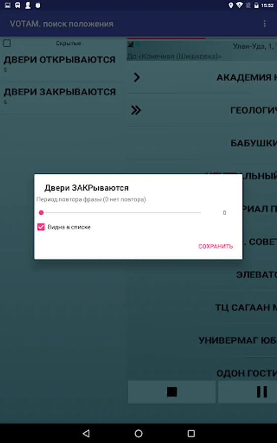 The app will announce the name of the stop at the approach to it, and the name of the next stop after the departure of the current.