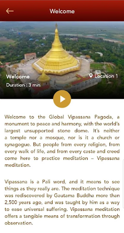 Take an audio-guided tour of Global Vipassana Pagoda a Monument of Peace and Harmony as founded and a vision by SN Goenka, constructed in the suburbs of Mumbai, India. It is a symbol of gratitude to Myanmar whose small set of people through the monastic teacher-student tradition, ensured the practical aspect of the teaching, ‘Vipassana’, be preserved its pristine purity since 2500 years.