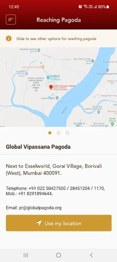 - Take self-guided audio tour of Global Vipassana Pagoda having 25 places of interest, available in 3 languages English, Hindi, Marathi