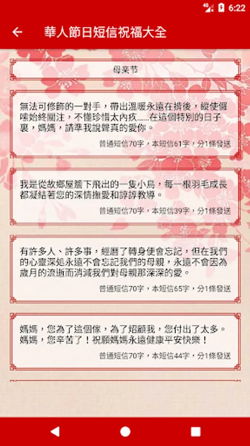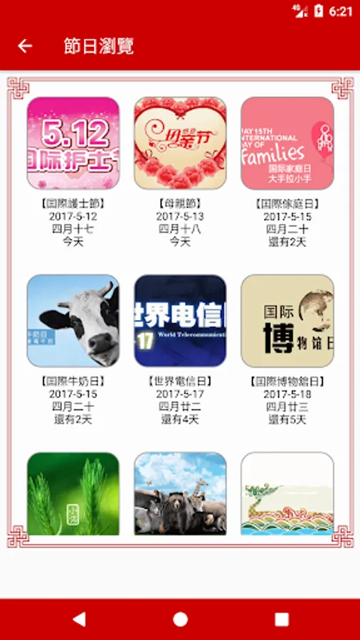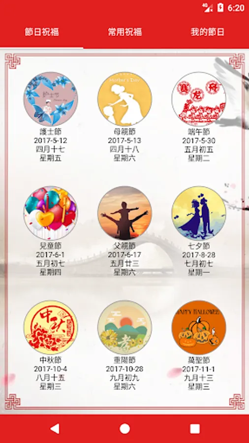 A selection of recent holiday greetings, exquisite holiday icons, festivals are divided into Chinese calendars and Gregorian calendars. You can send holiday blessings to family and friends through third-party applications such as SMS WeChat, and share the blessing information through sharing functions. Enter my holiday, you can note the important date of family and friends, and automatically remind you. Today in history, you can let you know about historical events in your spare time. Added a blessing message for special days and anniversaries.