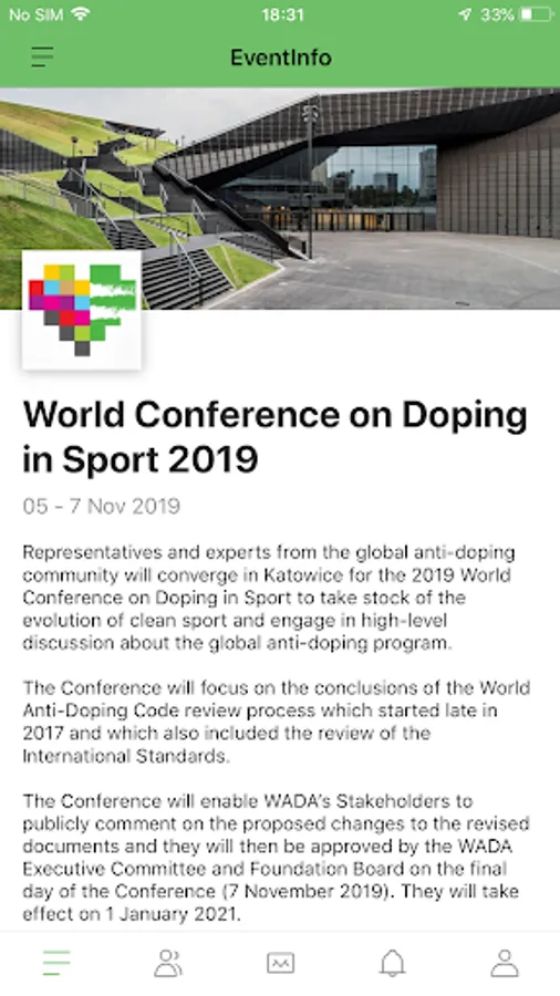 This Mobile App allows registered participants to the World Conference on Doping in Sport 2019 to view the program and speaker profiles, as well as to connect with other attendees. In addition, users will be able to build their personal agenda, get information on the sessions, the venue and much more.