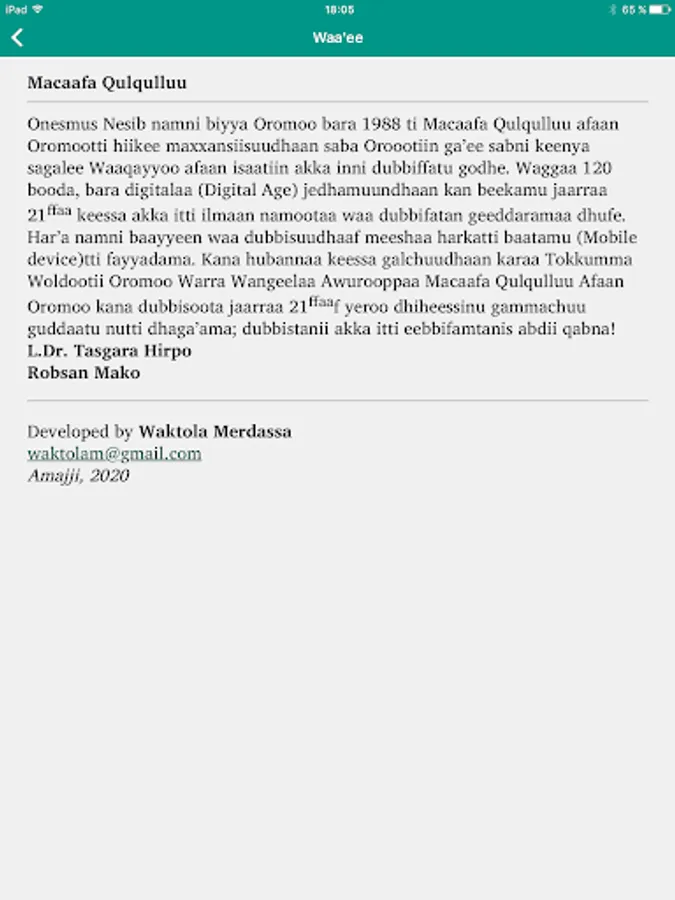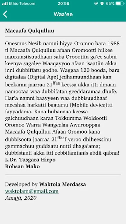 Onesmus Nesib namni biyya Oromoo bar 1899ti Macaafa Qulqulluu afaan Oromootti hiikee maxxansiisuudhaan saba Oromootiin ga'ee sabni keenya sagalee Waaqayyoo afaan isaatiin akka inn dubbiffatu godhe. Waggaa 120 booda, digitalaa (Digital Age) jedhamuundhaan can beekamu years 21ffaa keessa akka itti ilmaan namootaa waa dubbifatan geeddaramaa dhufe. Har'a namni baayyeen waa dubbisuudhaaf meeshaa harkatti baatamu (Mobile device) tti fayyadama. Kana hubannaa keessa galchuudhaan karaa Tokkumma Woldootii Oromoo Warra Wangeelaa Awurooppaa Macaafa Qulqulluu Afaan Oromoo kana dubbisoota jaarraa 21ffaaf yeroo dhiheessinu gammachuu guddaatu nutti dhaga'ama; dubbistanii akka itti eebbifamtanis abdii qabna!