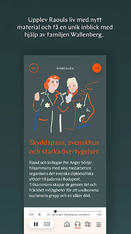 Pieces of Raoul is an app and part of the digital exhibition and city tour about Raoul Wallenberg's life and deeds. The story is narrated by Raoul's sister Nina Lagergren's granddaughter Cecilia Åhlberg. In the app, the listener gets to share Raoul's story from his childhood years on Riddargatan to his brave deed during the Holocaust. After taking part in the exhibition, the listener can take a stand on various issues, reflect on their civil courage and their own history.