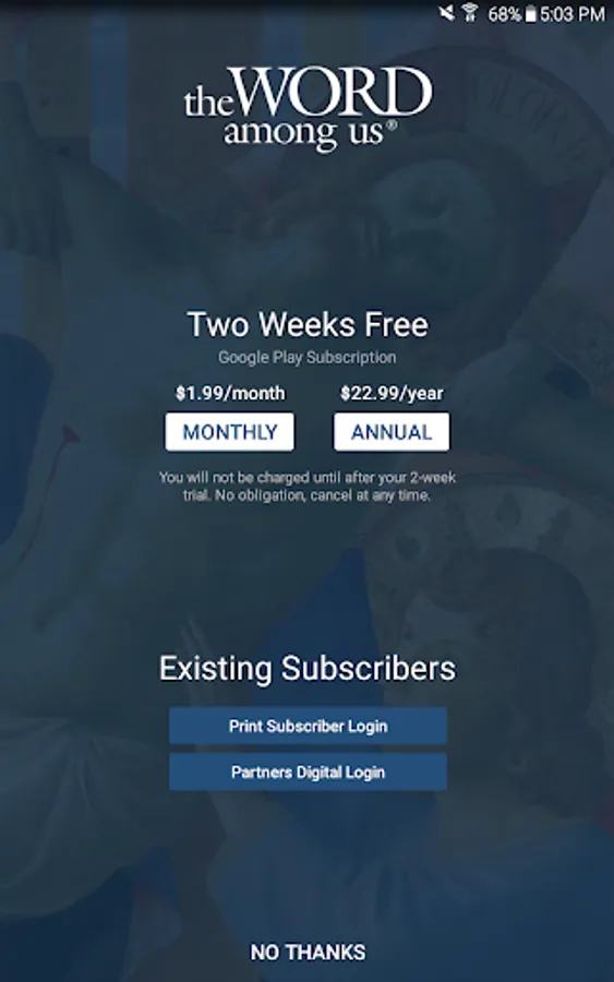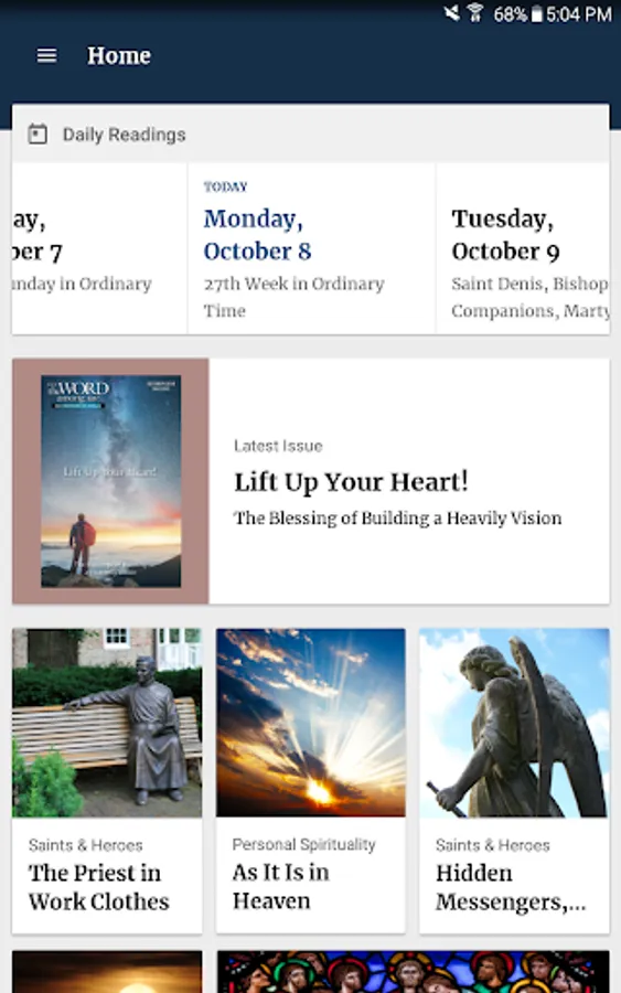 “The Word Among Us" is the largest daily devotional for Catholics (print & digital editions available). Beautifully designed for android, The Word Among Us app is completely ad free and includes a 2 week free trial subscription (Monthly or annual subscription required after the free trial ends).
