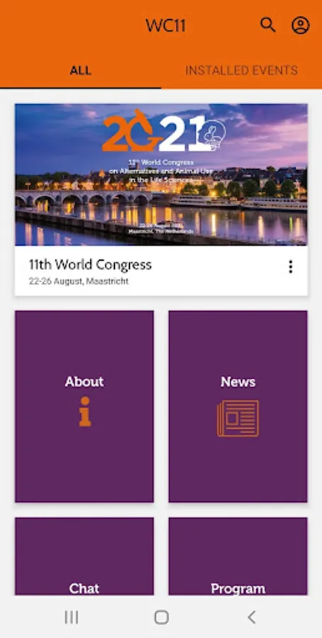 The official WC11 Congress App. WC11 stands for “11th World Congress on Alternatives and Animal Use in the Life Sciences 2021”. The WC11 congress will be held at the MECC Maastricht in the Netherlands from 22-26 August 2021