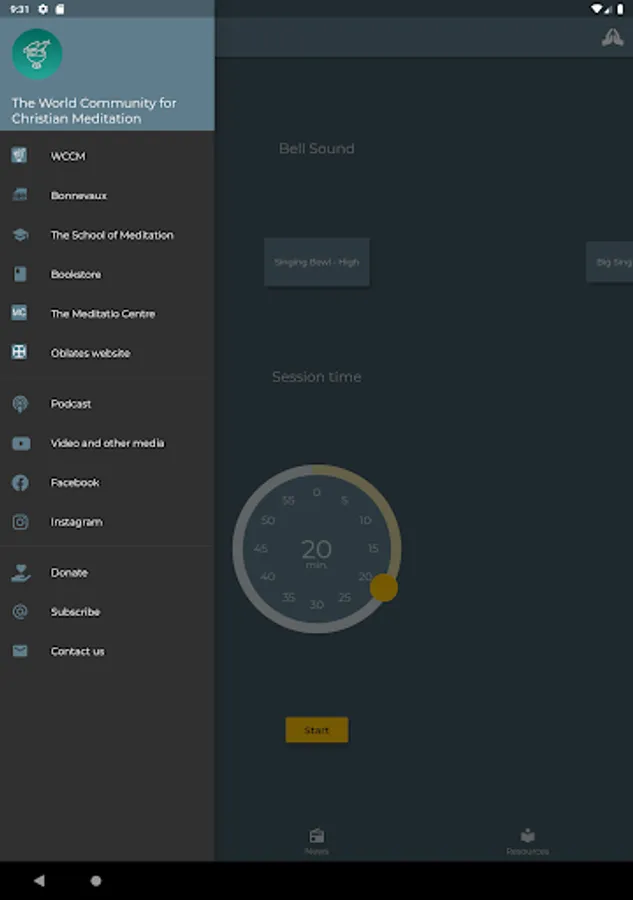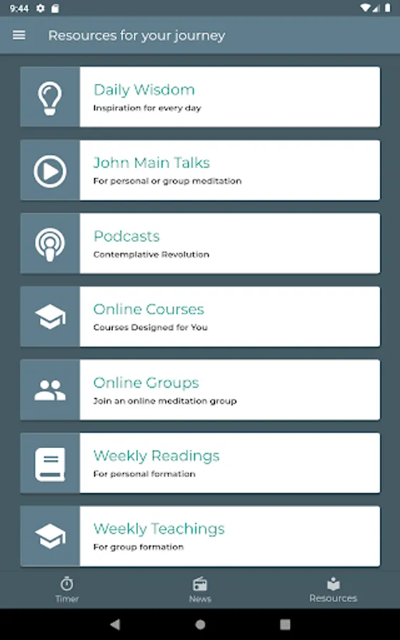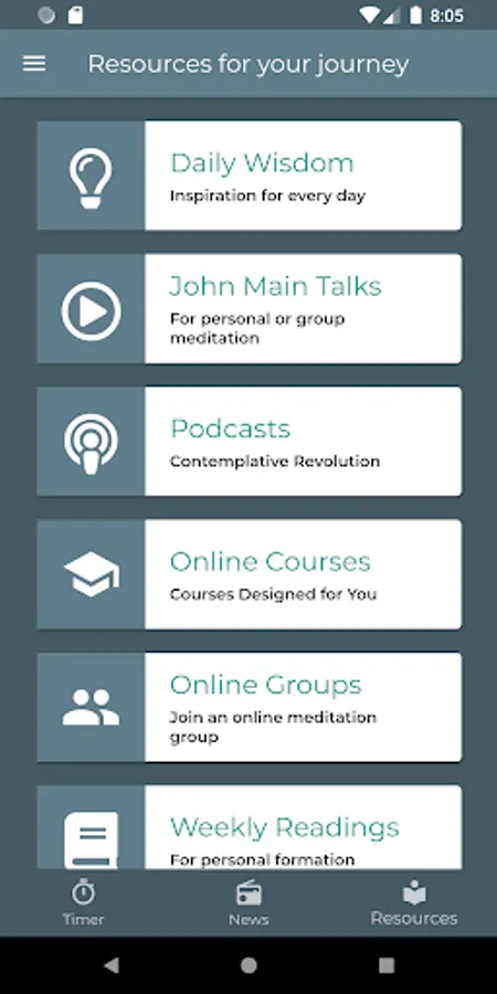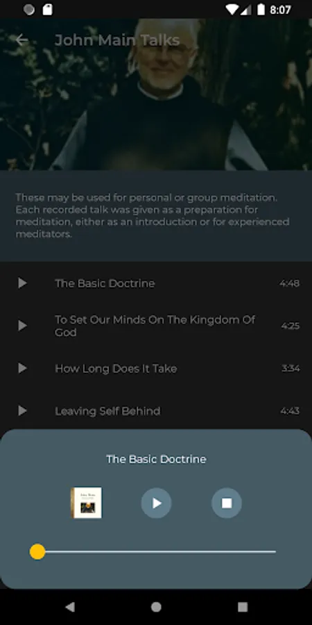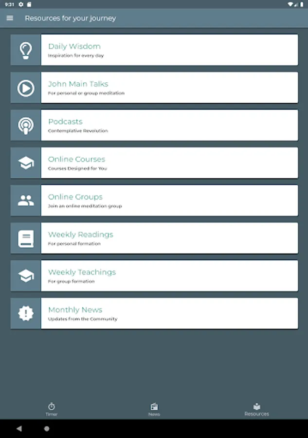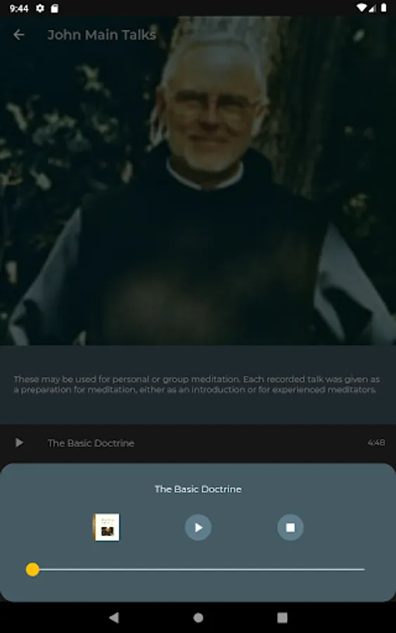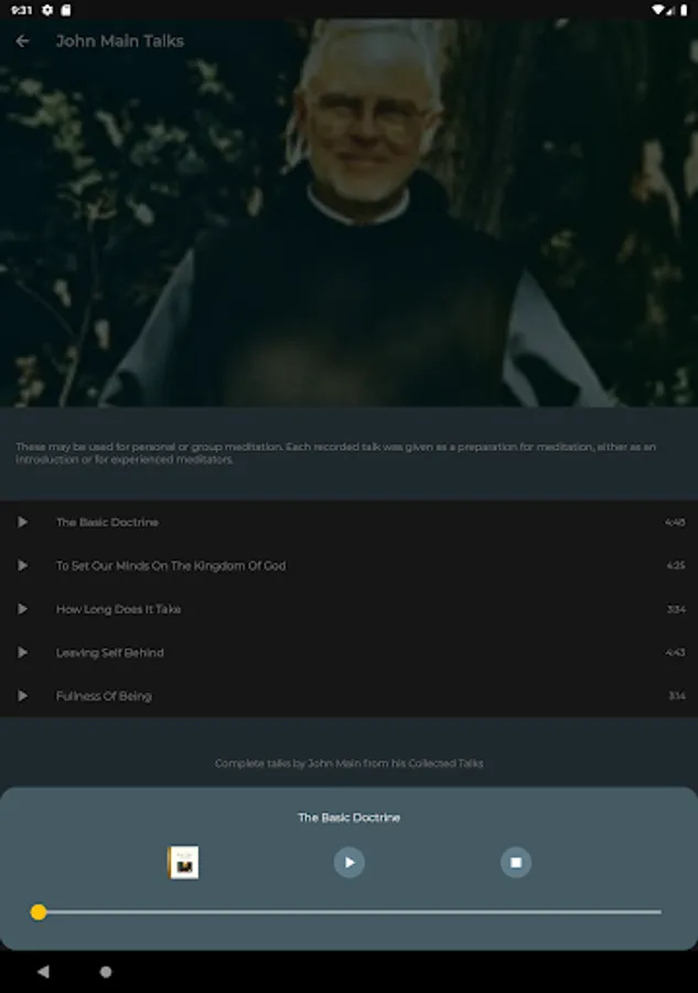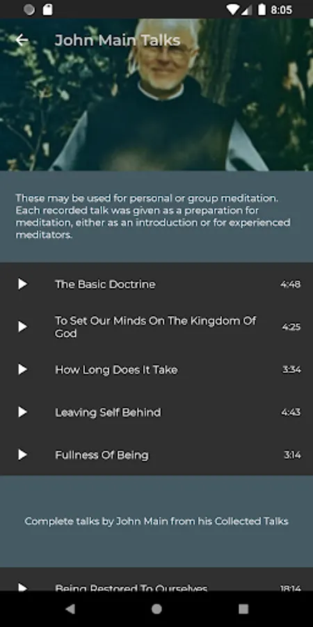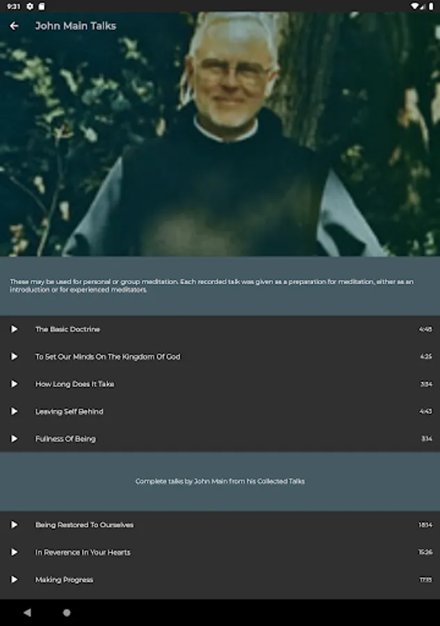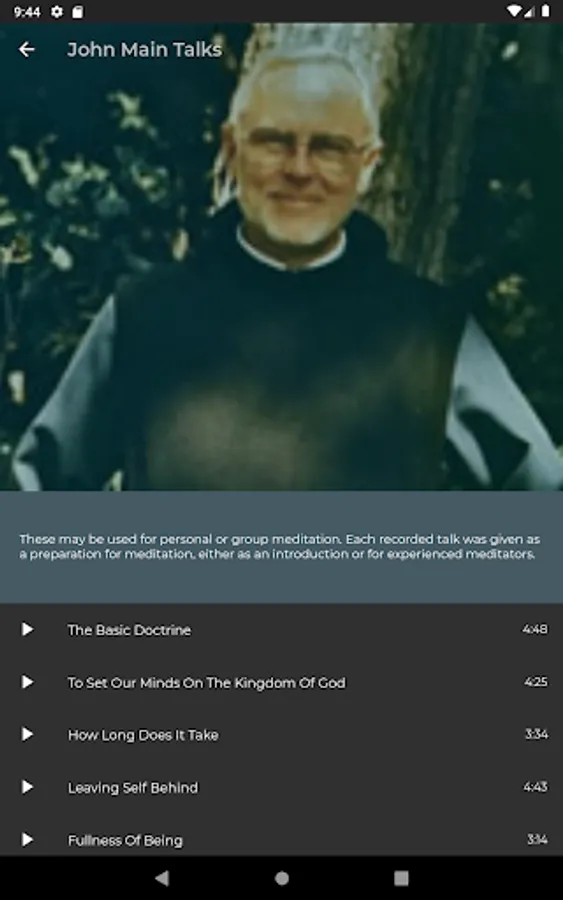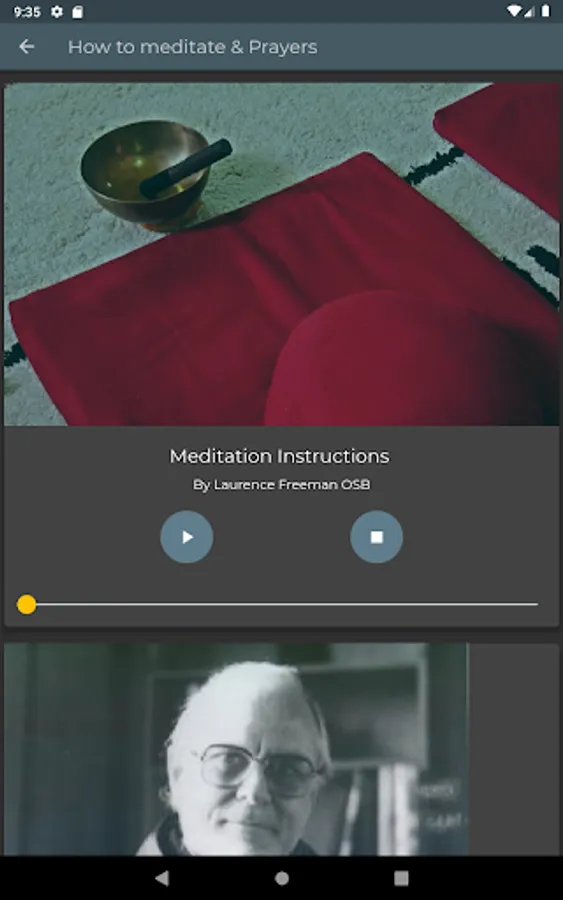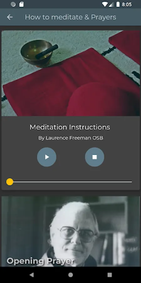 - quick access to meditation beginning and ending prayers from the meditation timer page, plus the possibility to play the audio of Fr. Laurence's meditation instructions.