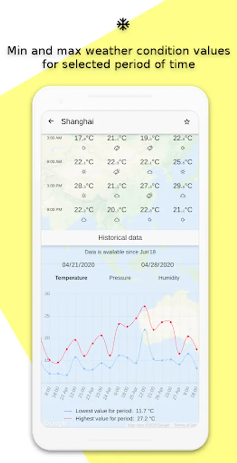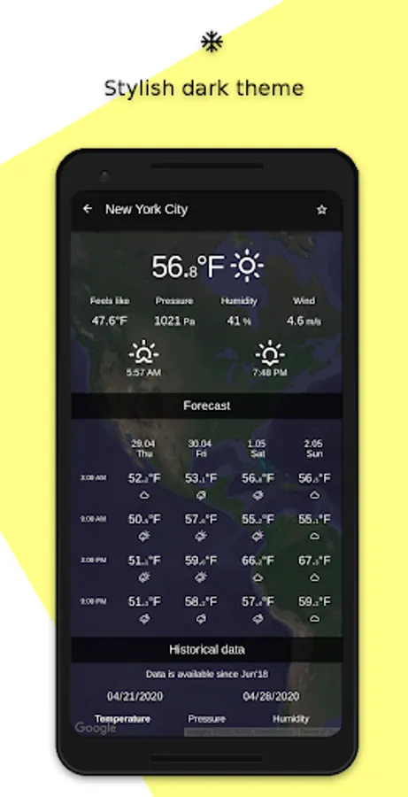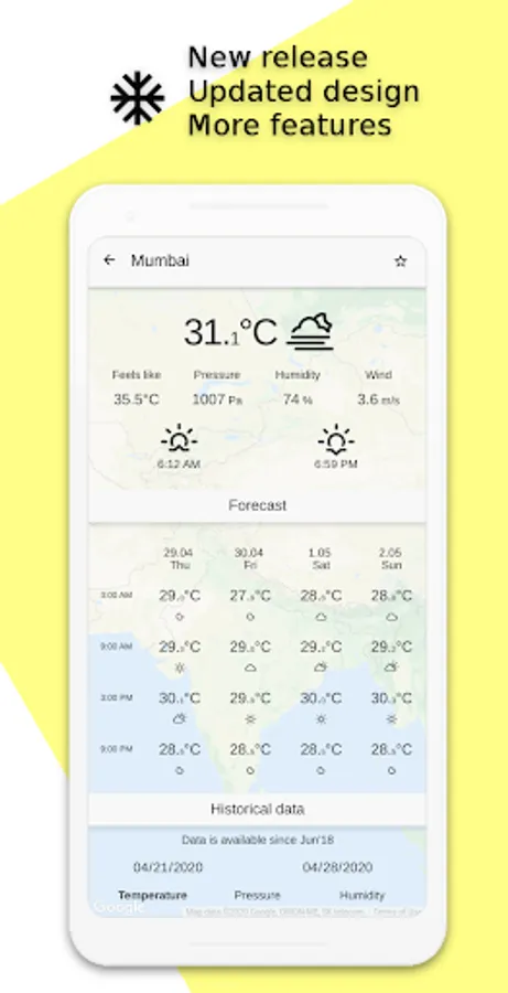 Time of sunrise and sunset, wind speed, humidity and presssure. Forecast for next 4 days. Historical data chart depicts max and min values for selected period.