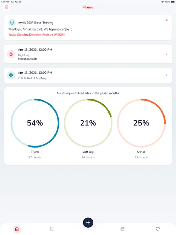 myWBDR is your comprehensive companion for managing hemophilia and von Willebrand disease (VWD). Seamlessly track your bleeds, pain levels, treatments, and health status so you can take control of your condition while contributing to cutting-edge research.